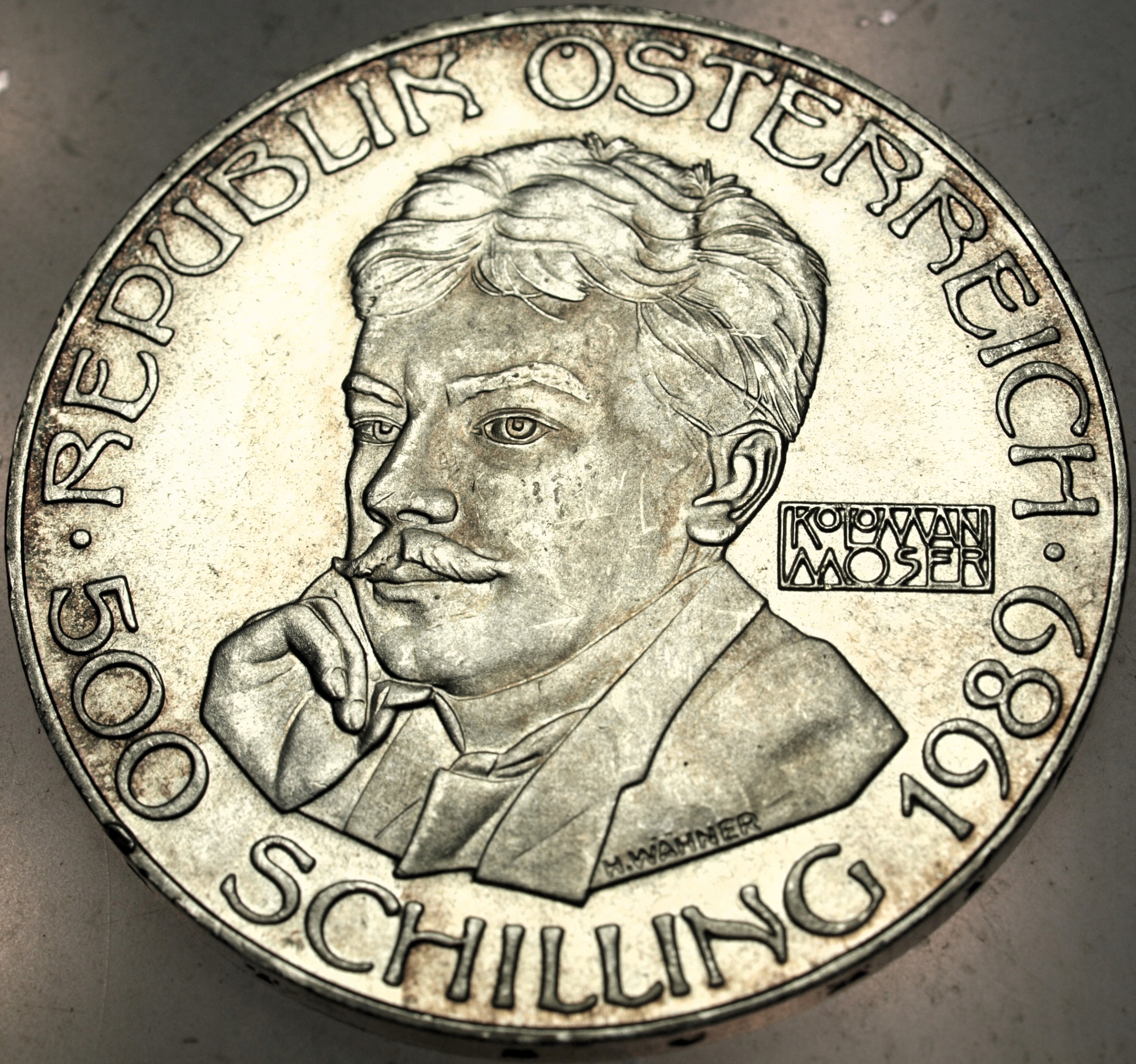 Austria 500 szylingów 1989 Moser SREBRO. ORYGINAŁ. SPRAWDŹ INNE AUKCJE - KOLEKCJONUJ RZADKIE WALORY Z NUMIZMATO!