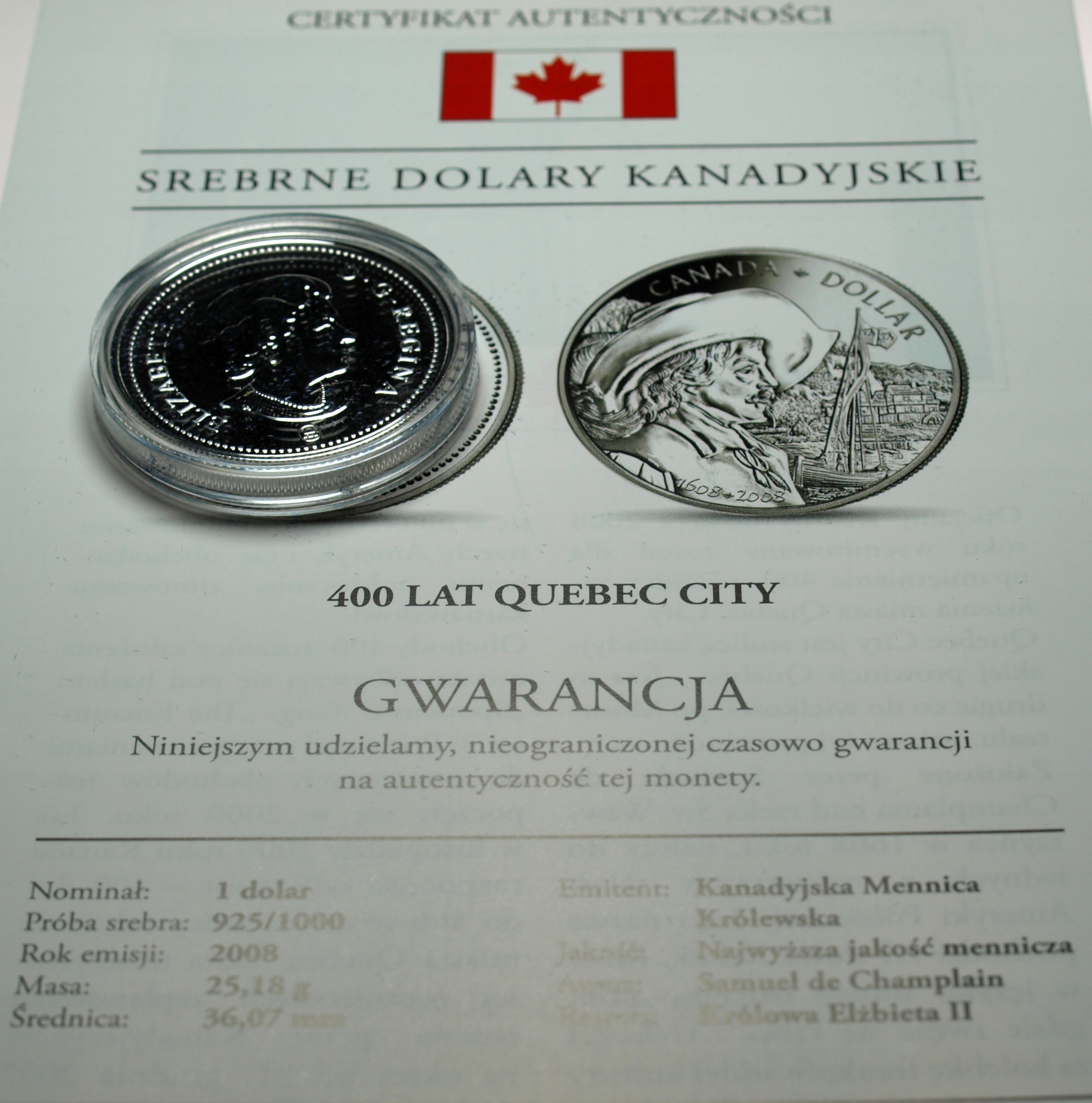 Kanada 1 dolar 2008 400-lecie miasta Québec SREBRO. ORYGINAŁ. SPRAWDŹ INNE AUKCJE - KOLEKCJONUJ RZADKIE WALORY Z NUMIZMATO!
