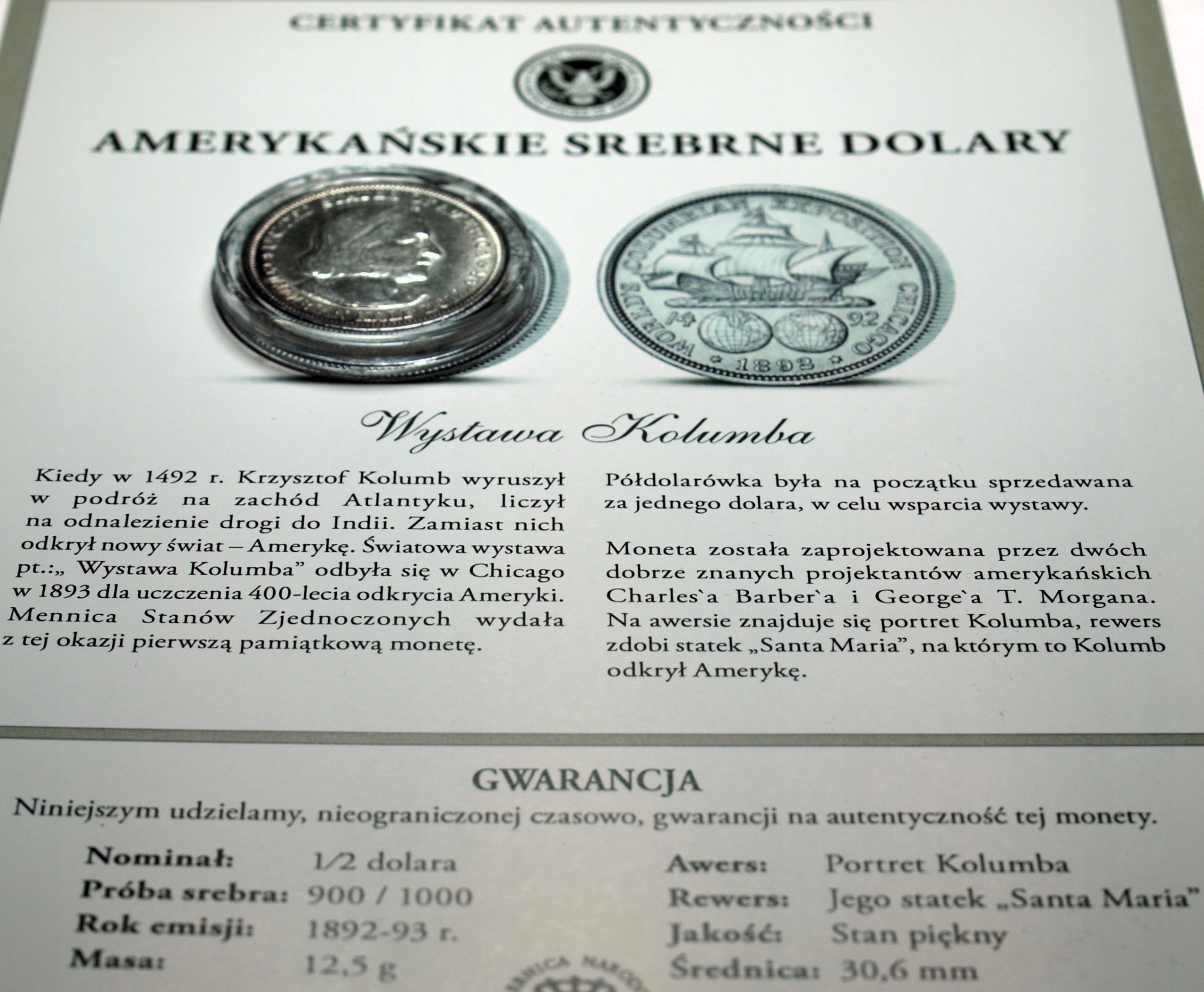 USA 1/2 dolara Half Dollar 1893 Wystawa Kolumba SREBRO. ORYGINAŁ. SPRAWDŹ INNE AUKCJE - KOLEKCJONUJ RZADKIE WALORY Z NUMIZMATO!