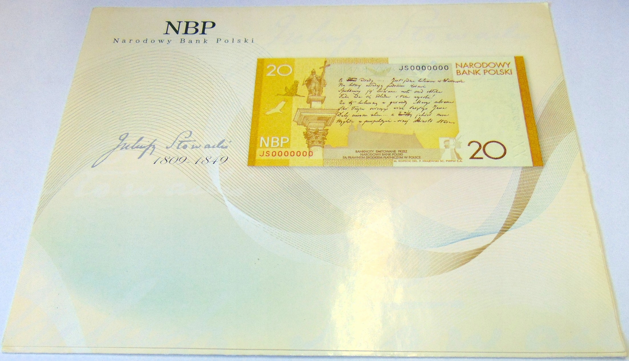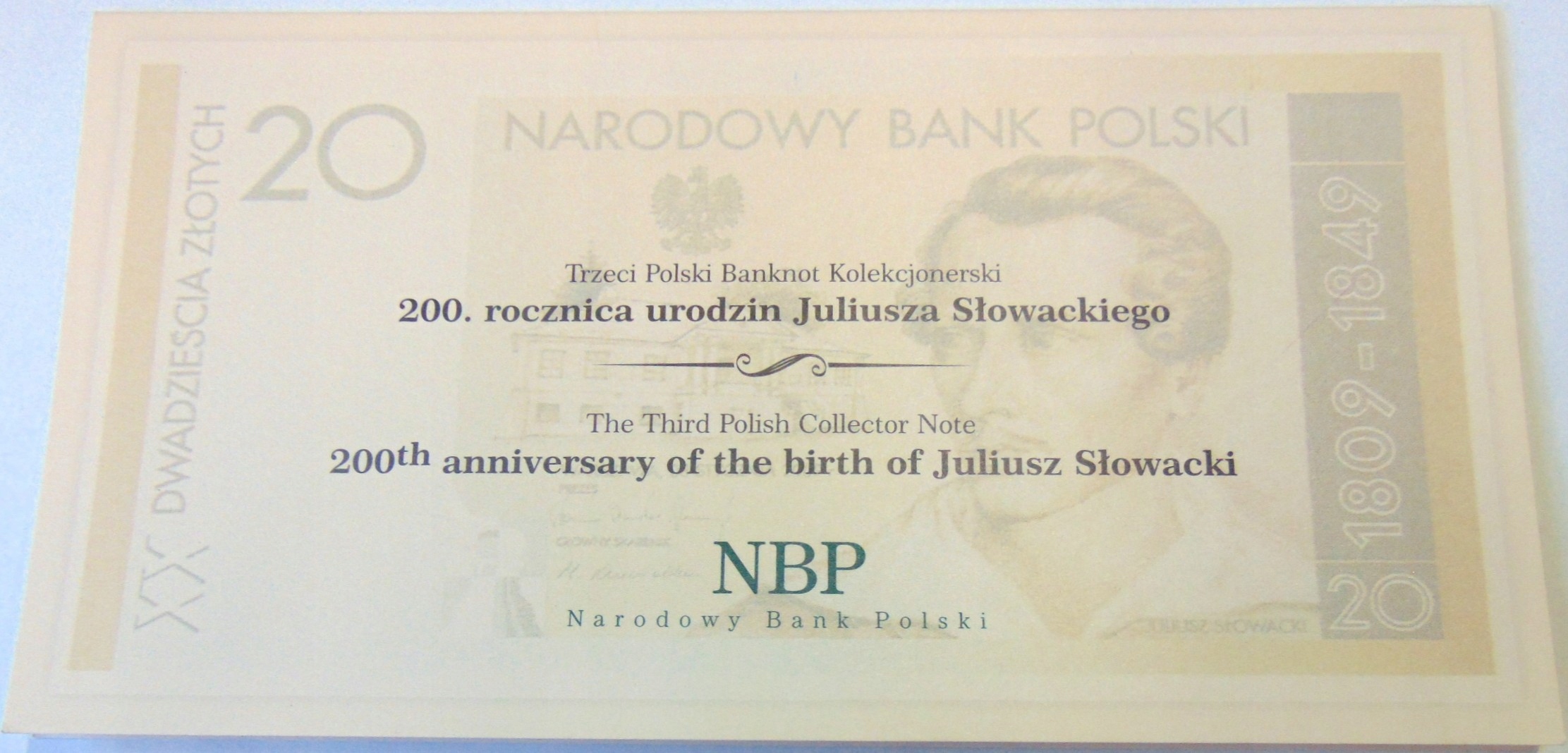2009 20 zł złotych Juliusz Słowacki banknot kolekcjonerski (nr 2). ORYGINAŁ. SPRAWDŹ INNE AUKCJE - KOLEKCJONUJ RZADKIE WALORY Z NUMIZMATO!