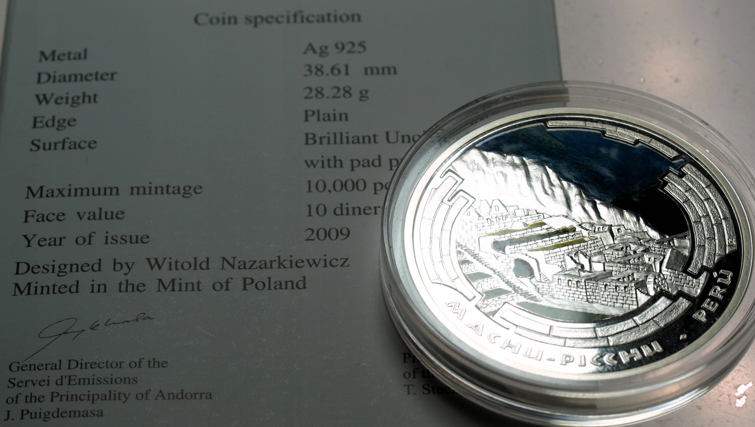Andora 10 dinarów diners 2009 Machu Picchu Peru Cuda Świata SREBRO. ORYGINAŁ. SPRAWDŹ INNE AUKCJE - KOLEKCJONUJ RZADKIE WALORY Z NUMIZMATO!