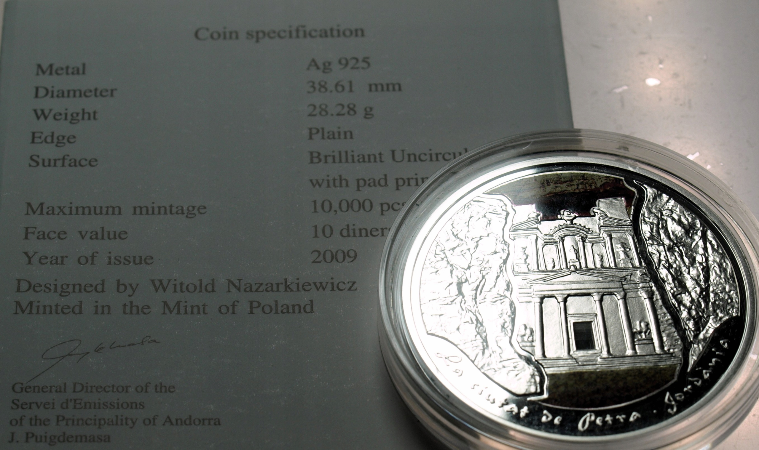 Andora 10 dinarów diners 2009 Petra Jordania Cuda Świata SREBRO. ORYGINAŁ. SPRAWDŹ INNE AUKCJE - KOLEKCJONUJ RZADKIE WALORY Z NUMIZMATO!