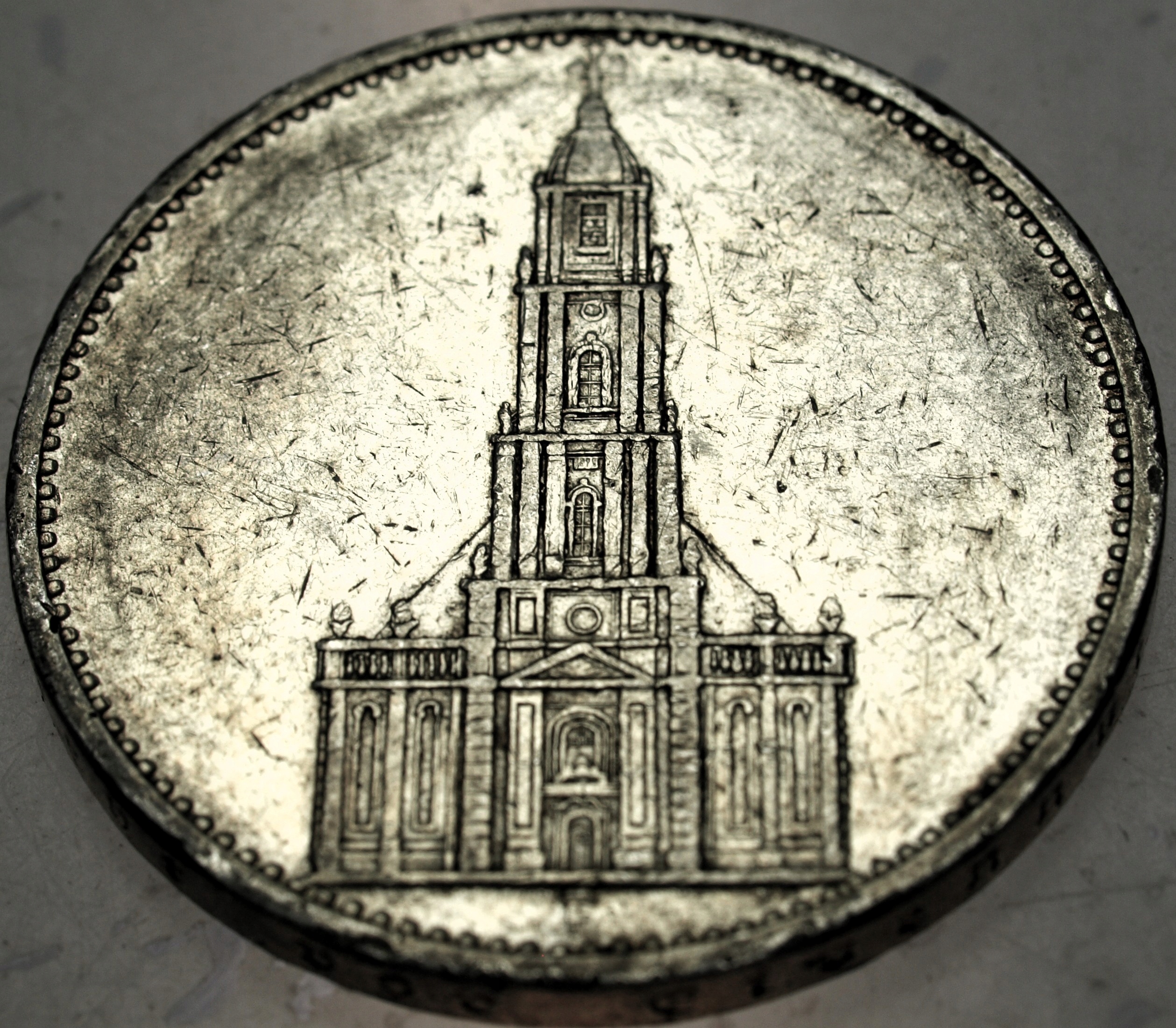 Niemcy 5 marek Reichsmark 1934 Kościół wieża SREBRO. ORYGINAŁ. SPRAWDŹ INNE AUKCJE - KOLEKCJONUJ RZADKIE WALORY Z NUMIZMATO!